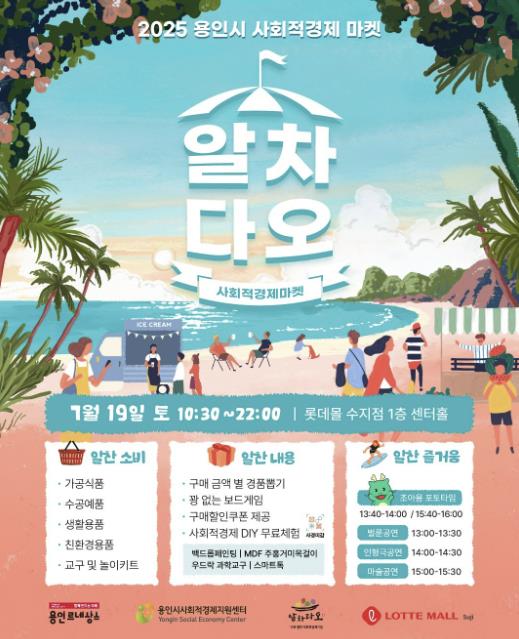 판매행사는 오전 10시 30분부터 오후 10시까지 롯데몰 수지점 1층 센터홀에서 진행된다. 행사엔 ▲참맛 사회적협동조합 ▲교육보드게임협동조합 ▲당신의부엌협동조합 ▲한국아로마테라피생활문화협동조합 ▲㈜교아당 ▲협동조합수풍로상단 ▲㈜365문화예술센터 ▲디혜협동조합 ▲거북이날다사회적협동조합 ▲㈜하이밀 ▲(사)한국장애인농축산기술협회 등 용인시 사회적경제기업 총 11개사가 참여한다.