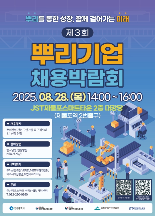 이번 채용박람회는 고용노동부와 인천광역시, 관계기관이 협력해 추진하는 ‘2025 인천 지역혁신 프로젝트’의 일환으로, ‘뿌리를 통한 성장, 함께 걸어가는 미래’를 슬로건으로 내걸었다.