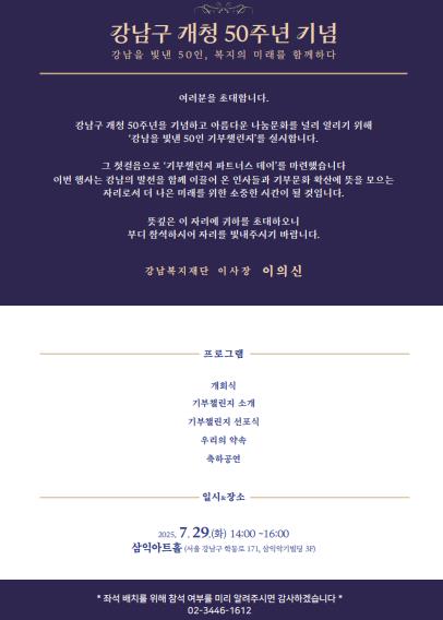 강남구 개청 50주년을 기념해 강남복지재단 주관으로 진행되는 이번 행사는 ‘강남을 빛낸 50인, 복지의 미래를 함께하다’ 기부 챌린지의 시작을 알리는 자리다. 강남 발전에 기여한 사회 지도층 50인의 릴레이 기부를 통해 지역공동체 내에 지속가능한 나눔문화를 정착시키는 것이 목표다.