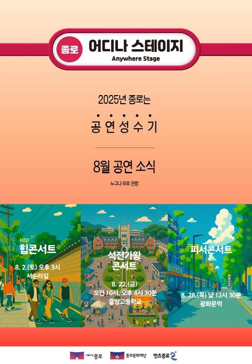 8월 2일에는 서순라길에서 MZ세대를 겨냥한 젊고 트렌디한 무대 ’힙(HIP)콘서트’가 열린다. 정화예술대학교 청년 예술인들이 디제잉과 보컬, 다양한 퍼포먼스를 선보이고 종로의 여름 오후를 뜨겁게 달굴 예정이다.
