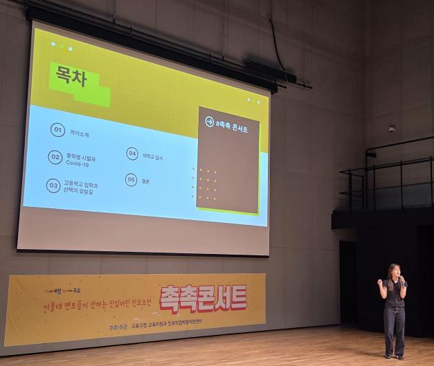‘촉촉콘서트’는 구로진로직업체험지원센터와 서울대학교 멘토링 교육봉사 동아리인 ‘드림컨설턴트’가 2년 연속 공동 주관하여 청소년들의 꿈과 진로 고민에 관해 이야기하는 소통 프로그램이다. 학생들에게 다양한 진로 강연과 학과 정보를 제공해 학생들의 진로 탐색의 기회를 확대하고, 자기주도적인 진로 설계 역량을 강화하고자 마련했다.