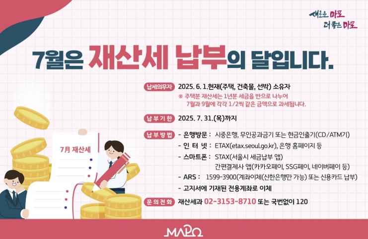 박강수 마포구청장은 “재산세는 우리 마포의 미래를 함께 만들어가는 소중한 밑거름”이라며, “납부 기한 내 성실한 납부를 부탁드리며, 구민 여러분의 참여와 책임이 더 나은 마포를 만드는 힘이 될 것이다”라고 전했다.