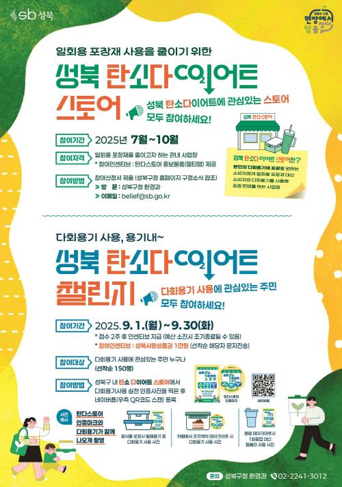 성북구는 다회용기 사용을 장려하기 위한 ‘성북 탄소다이어트 챌린지’도 함께 운영할 계획이다. 챌린지에 참여하려면 성북 탄다 스토어에서 다회용기를 사용한 활동을 네이버폼을 통해 인증하면 된다.