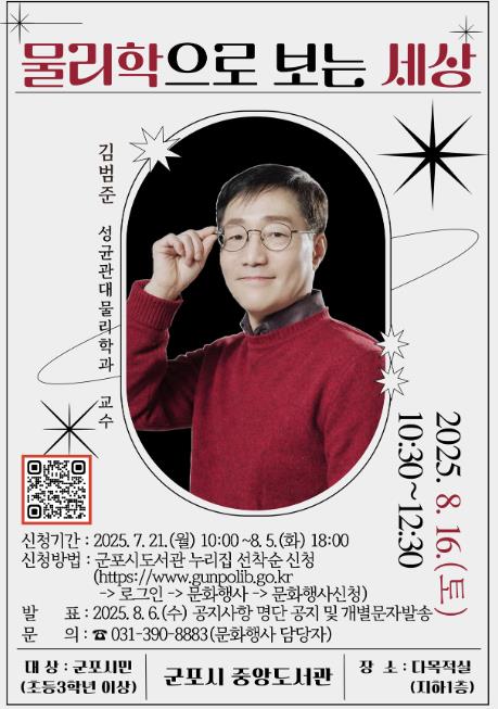 강연은 8월 16일 토요일 오전 10시 30분부터, 중앙도서관 지하1층 다목적실에서 진행되며, 초등 3학년 이상의 군포시민 70명을 대상으로 선착순 모집한다.