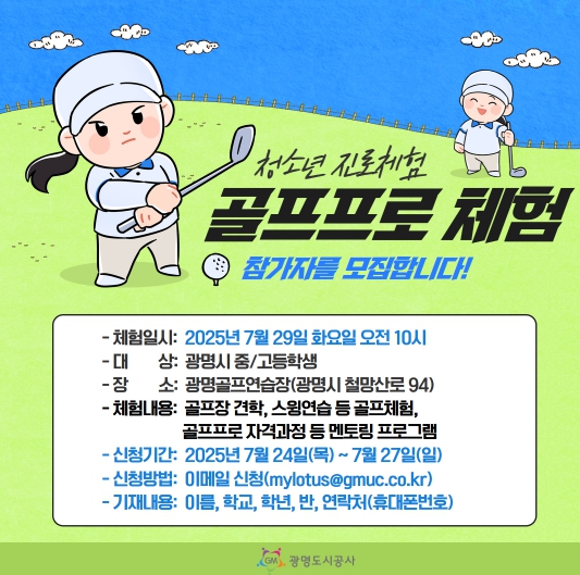 청소년 골프 프로 진로체험 프로그램은 7월 29일 화요일 오전 10시, 광명골프연습장 정기 휴장일에 진행된다. 해당 프로그램은 광명시 관내 중·고등학생을 대상으로 하며, 골프 프로를 꿈꾸는 청소년들에게 폭넓은 지식을 전달할 계획이다.