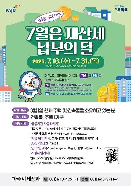 최윤순 세정과장는 “재산세는 지역 발전과 공공 서비스 제공에 쓰이는 중요한 재원”이라며 “납기 내 납부하지 않을 경우 가산세가 발생하므로 기한 내 꼭 납부해 불이익을 받지 않도록 유의해 달라”라고 당부했다.