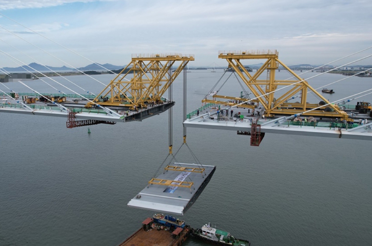 이날 공사는 다리 위 총 67개 상판 가운데 사장교 2개의 주탑 중앙에 위치한 길이 15m, 너비 33m, 무게 198t의 강재 상판을 최종 거치하는 것으로, 윤원석 인천경제자유구역청장과 관계 공무원 등이 지켜보는 가운데 성공적으로 마무리 됐다.