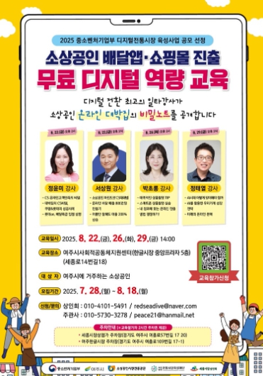소상공인 디지털 역량강화 교육은 8.22., 8.26,, 8.29. 오후 2시 중앙프라자 5층 여주시 사회적공동체지원센터에서 열릴 예정이며, 교육참가 접수 및 문의는 전화 및 온라인(네이버폼)으로 하면된다.