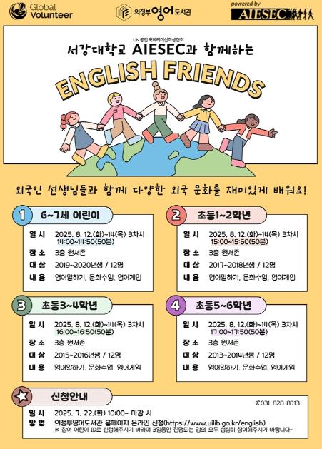 6세부터 13세 어린이를 대상으로, 외국인 자원봉사자와 대학생 멘토가 함께 참여해 다양한 나라의 문화를 체험하고 영어로 소통하는 프로그램으로 구성했다. 아이들은 게임과 미술, 문화활동을 통해 자연스럽게 영어에 노출되고, 각국의 전통을 배우며 문화다양성에 대한 이해를 넓히게 된다.