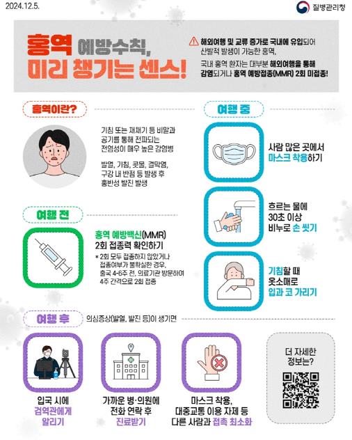조지현 감염병관리과장은 “해외여행을 앞두고 있는 시민들께서는 홍역 예방접종력을 반드시 확인해 면역력을 갖추기 바란다”며 “특히 유행 지역 방문 후 의심 증상이 있을 경우 신속한 진료가 중요하다”고 말했다.