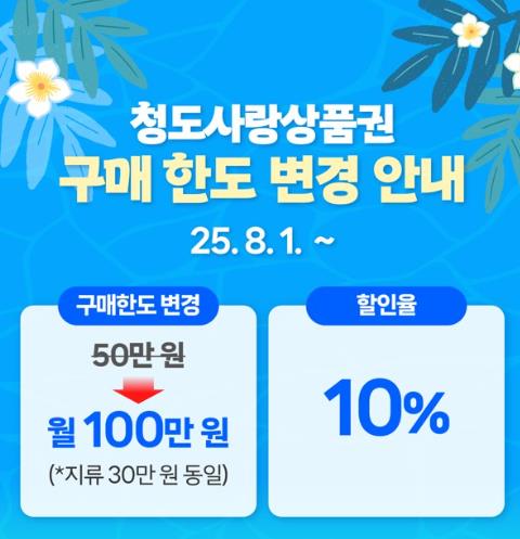 김하수 청도군수는 “지역사랑상품권은 지역경제에 실질적으로 활력을 불어넣는 시책”이라며 “한도 확대가 군민과 소상공인 모두에게 도움이 되길 기대하며, 앞으로 군민이 더 많은 혜택을 누릴 수 있도록 행정적 지원을 아끼지 않겠다”고 말했다.