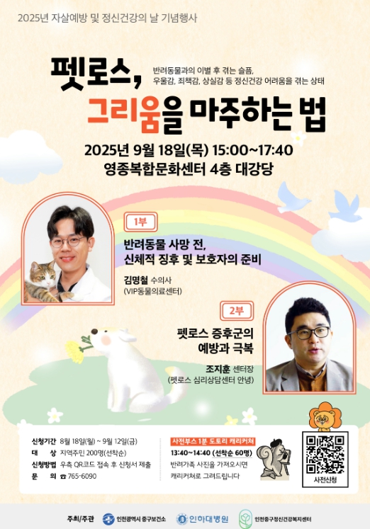 배재남 인천중구정신건강복지센터장은 “정신건강은 개인의 행복뿐 아니라 지역사회의 건강한 미래를 위해 꼭 지켜야 할 가치”라며, “이번 강연이 반려동물과의 이별로 느끼는 깊은 슬픔을 조금이나마 덜어내고, 마음이 회복되는 시간이 되길 바란다”라고 말했다.
