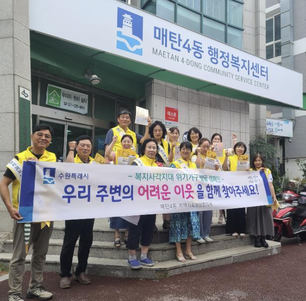 민상희 매탄4동장은 "매탄4동 행정복지센터 또한 지속적으로 위기가구 발굴 활동을 이어가며, 관내 복지안전망 구축을 위해 최선을 다하겠다. 무더위에 캠페인에 참여해주신 지역사회보장협의체 위원님들께 감사드린다.”고 말했다.