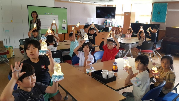 수업은 버려지는 양말목과 학생들이 마신 음료수병을 재활용하여 발광다이오드(LED) 감성 랜턴을 만드는 체험형 환경 교육으로 진행됐으며, 매곡초등학교 1학년~6학년 50여 명의 학생이 참여했다.