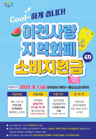 이천시는 지난해 유사한 소비지원정책을 통해 지역 상권에 활력을 불어넣은 바 있으며, 이번에도 여름 휴가철과 복날 등 계절적 소비 증가 시기에 맞춰 이벤트를 기획했으며 시민과 소상공인 모두에게 실질적인 도움이 될 것으로 기대한다.
