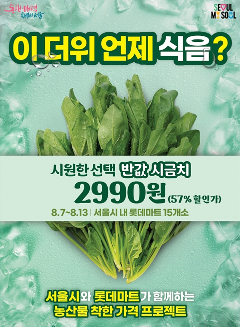 할인 행사는 8월 7일부터 13일까지 6일간(8월 10일 의무휴업일. 단, 청량리점은 8월 13일 의무휴업일) 서울 시내 롯데마트 15개 매장에서 시금치 1단(250g 내외/단)을 정상가격 6,990원 대비 57% 할인된 2,990원에 판매한다.