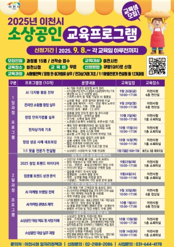 교육은 이천시에 거주하는 시민이면 누구나 참여할 수 있으며 전액 무료로 진행된다. 신청 기간은 9월 8일부터 각 과정 시작 전일까지이며, 이천시청 누리집 또는 홍보 포스터 내 정보무늬(QR코드)를 통해 신청할 수 있다.