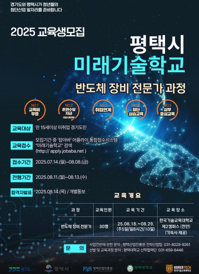 앞서 평택시는 지난 7월 11일까지 미래기술학교 첫 과정인 반도체 공정·장비 엔지니어 과정 교육생 모집을 완료했으며, 서류·면접 평가를 거쳐 교육생을 선발한 뒤 오는 7월 21일부터 본격적인 교육을 시작할 예정이다.