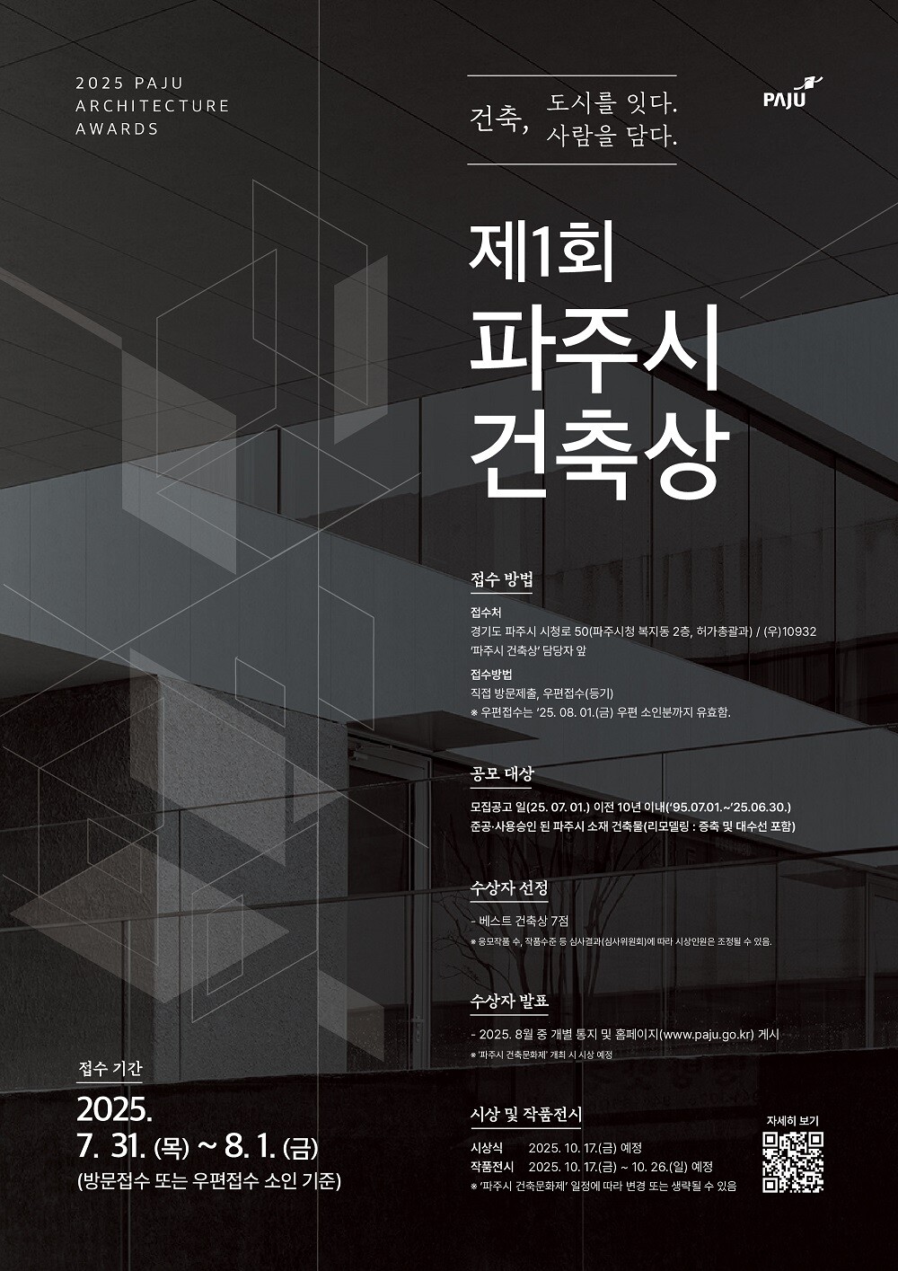 파주시 관계자는 “이번 건축상은 도시문화와 건축적 정체성을 시민과 함께 만들어가는 첫걸음”이라며, “공공성과 사회적 가치를 담은 건축을 널리 조명하겠다”고 강조했다.