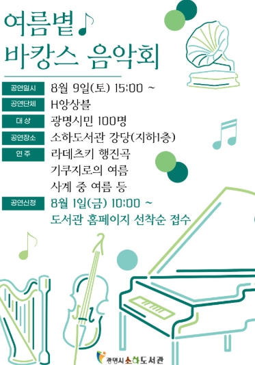 한편, 소하도서관은 9월 독서의 달을 맞아 ‘해질녘 가을 음악회’도 마련한다. 영화·애니메이션 오리지널사운드트랙(OST)과 클래식 명곡으로 구성된 이번 공연은 오는 9월 19일 오후 7시 소하도서관 강당에서 열리며, 9월 5일 오전 10시부터 광명시도서관 누리집에서 사전 신청할 수 있다.