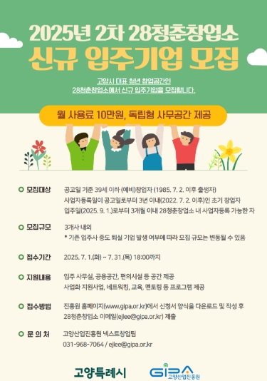 28청춘창업소는 덕양구청 인근에 있는 청년 창업공간으로, 총 23개의 독립형 사무실과 회의실, 휴게실, 공용창고 등 다양한 공용시설을 갖추고 있다. 또한 덕양구청, 덕양우체국, 화정역 등과 인접해 있어 접근성과 편의성이 좋다.