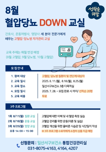 3주 완성 프로그램으로 8월부터 10월까지 총 3달간 일산서구보건소 3층 다목적실에서 진행되며, 교육 주제는 매월 변경된다(8월 고혈압 교실, 9월 당뇨병 교실, 10월 고혈압 교실).