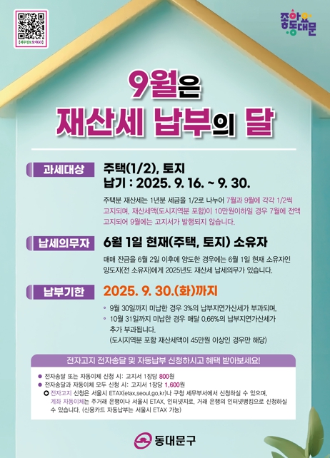 아울러 거주지 변동 등으로 고지서를 받지 못했거나 납부와 관련해 궁금한 점이 있는 경우에는 동대문구 세정과로 문의하면 상세한 안내를 받을 수 있다.