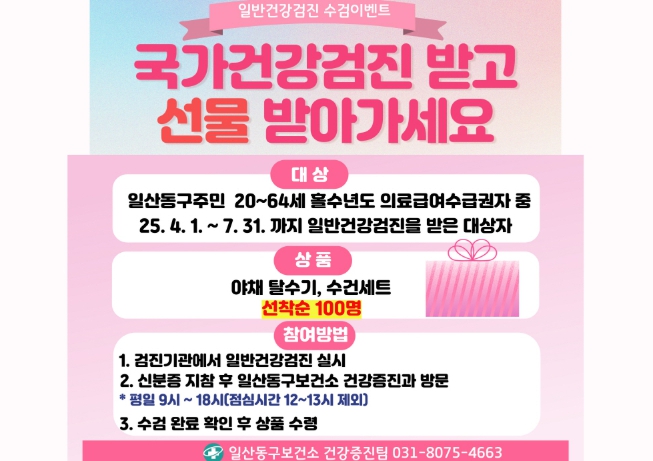 검진 대상 및 기관 확인은 국민건강보험공단 또는 일산동구보건소 건강증진팀에 문의하면 된다.