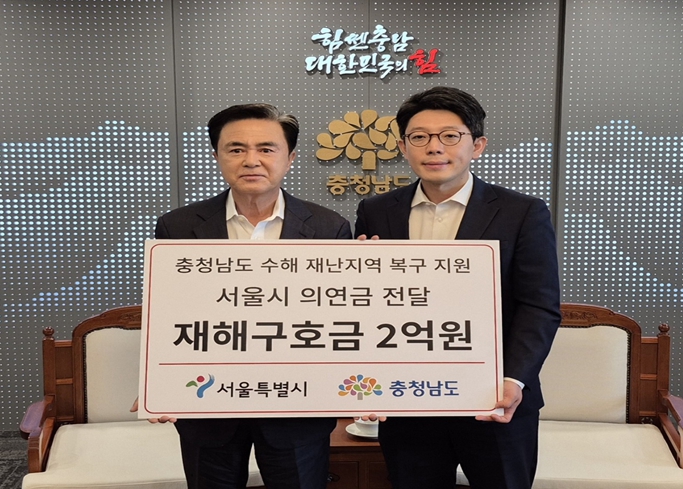 기부금 전달식은 이날 오전 10시 충남도청 도지사실에서 열렸으며, 김병민 서울시 정무부시장과 김태흠 충청남도지사가 참석했다.