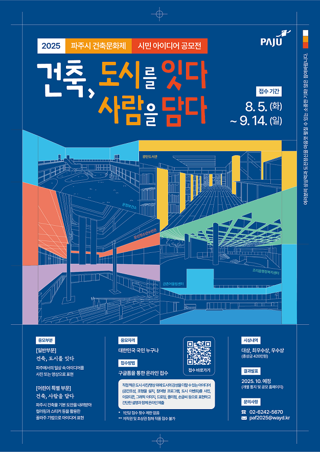 파주시는 10월 개최 예정인 ‘2025 파주시 건축문화제’와 연계해 ‘건축, 도시를 잇다 사람을 담다’를 주제로 시민 아이디어 공모전을 진행한다.