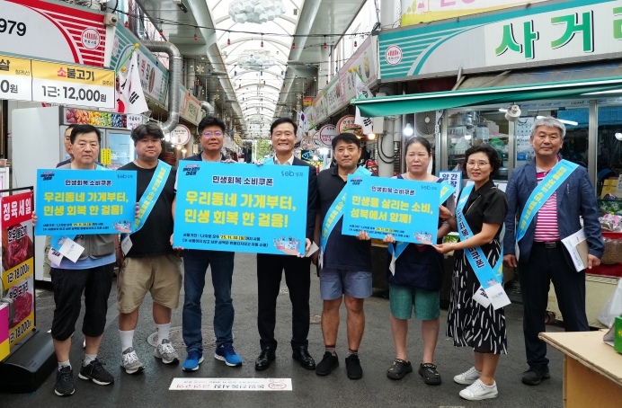 28일 성북구는 돈암전통시장에서 소비 릴레이 캠페인을 펼치며 소비쿠폰 사용 분위기 확산에 나섰다. 이 자리에는 이승로 성북구청장을 비롯해 구 직원 그리고 시장 상인이 함께해 구민과 직접 만나 소비쿠폰 사용을 독려했다.