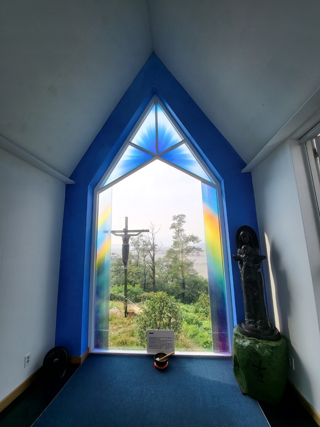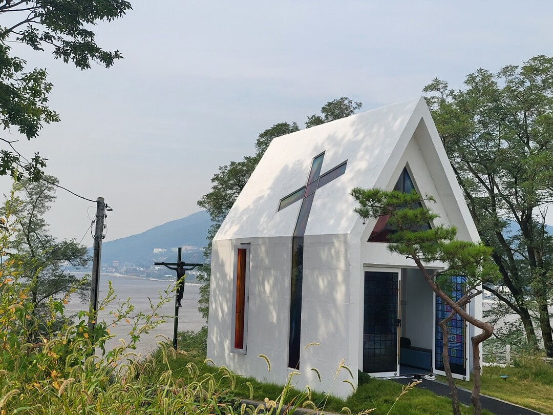 스테인드글라스로 장식된 문을 열고 들어서면 정면의 유리 통창 너머로 바다 풍경과 창 가까이 예수상이 먼저 눈에 들어온다. 늘 고요와 침묵과 경건함으로 비어 있어 언제나 누구나 들어가서 기도와 명상을 할 수 있다. 동검도 채플은 아주 작은 공간이라도 한없이 넓게 품어주는 편안함이 있다.