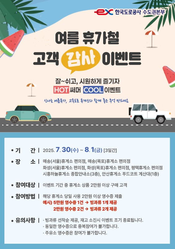 한국도로공사 수도권본부는 여름 휴가철을 맞아 수도권 서부지역 주요 고속도로 휴게소 7곳에서 고객 감사 이벤트를 실시한다.
