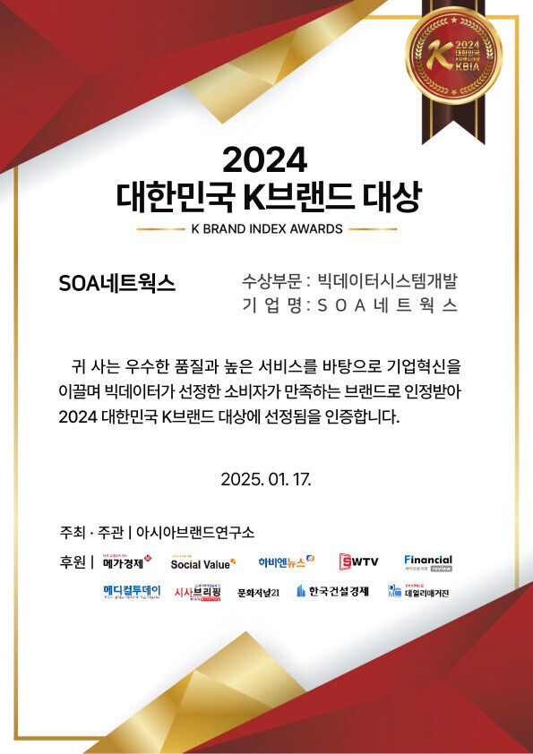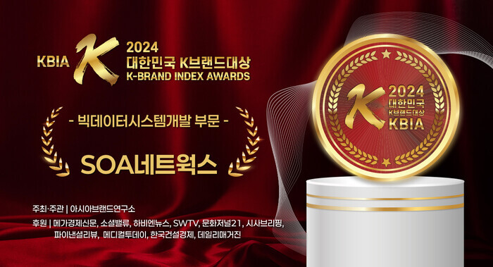 IT 선도기업 ‘SOA네트웍스’가 ‘2024 대한민국 K브랜드대상’(이하 K브랜드대상) 빅데이터시스템개발 부문에서 대상을 수상했다.