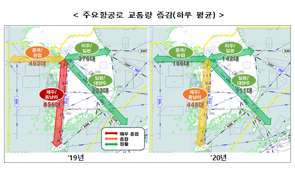 우리나라 하늘길 중에서 가장 바쁜 항공로 구간은 ‘서울-제주’ 구간(B576·Y711·Y722)으로 연간 163,855대가 이용했고(전체 대비 39%), 이는 전년 대비 47.5%(312.389→163,855대) 감소한 것이다.