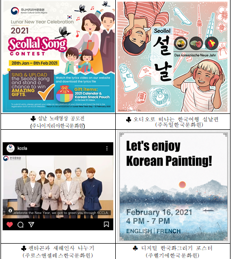 ▲ 주뉴욕한국문화원에서는 타악연주자인 김소라의 타악공연(장단: 숨의 대화)을 선보이고, ▲ 주호주한국문화원에서는 한국 설을 맞이해 새해 복을 부르는 음식과 전통주를 배우는 한식 프로그램을 생중계(2. 12.)한다.