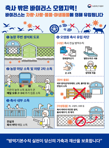 중수본 관계자는 “농장주는 축사 밖이 광범위하게 오염되어 있을 수 있다는 인식하에 방역에 각별히 신경써 달라”고 당부하며,