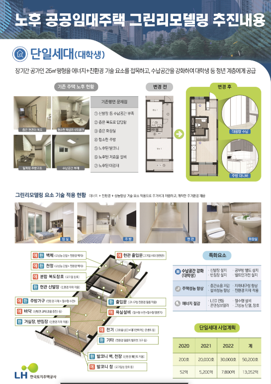 ‘단일세대 리모델링’은 기존 노후 영구임대주택을 대상으로 에너지저감 기술과 친환경 자재를 적용한 리모델링 후 대학생, 주거약자 등 1인 가구에 공급하는 사업이다.