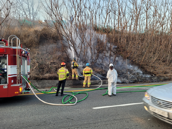 부부는 갓길에 차를 세우고 119에 화재신고를 한 후 주변을 둘러보다 물이 담긴 고무통과 양동이를 발견하고 양동이에 물을 담아 수차례 운반하며 화재 초기에 불길을 잡았다.