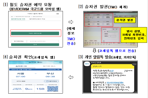 이를 개선하기 위해 국방부는 작년 7월부터 KORAIL측과 지속적인 협의를 통해 ‘코레일톡’ 앱과 연동되는 ‘모바일 철도 승차권’을 서비스를 지원받게 되었다. 이로써 철도예약으로부터 승차권 발권까지의 전 과정이 모바일 기능을 통해 해결됨으로써 개인 휴대폰에서 ‘모바일 승차권’ 확인 후 열차에 바로 탑승할 수 있게 되었다.