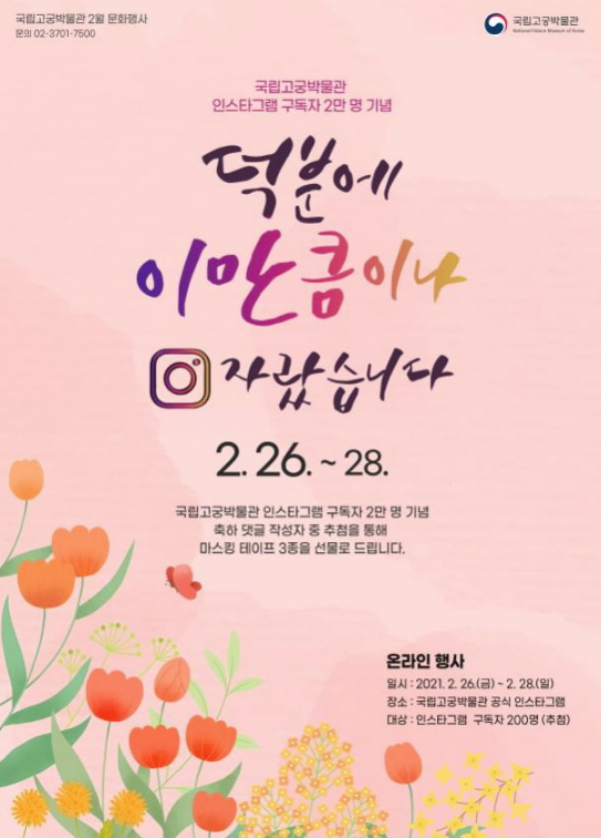 구독자 2만 명 돌파 기념으로 진행하는 「덕분에 이만큼이나 자랐습니다」행사는 국립고궁박물관 공식 인스타그램에서 진행된다. 참여 방법은 26일에 인스타그램에 게시되는 행사 게시물에 구독자 2만 명 돌파 축하 댓글을 남기면 참여가 완료된다.