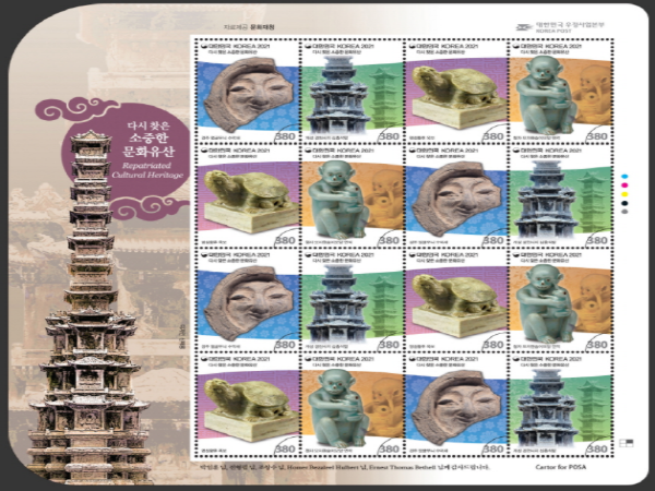 이번에 기념우표로 발행되는 환수 문화재는 ▲ 경주 얼굴무늬 수막새(박일훈), ▲ 개성 경천사지 십층석탑(헐버트, 베델), ▲ 명성황후 옥보(조창수), ▲청자 모자원숭이모양 연적(전형필) 등 총 4종으로 환수 과정에서 개인 차원의 노력이 반영되어 있는 문화재들이라서 그 가치가 더욱 빛을 발한다.