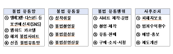 중점 단속대상은 보안메신저·다크웹 등 성착취물 불법유통망을 비롯하여 성착취물,불법촬영물,불법합성물 등을 제작·유통하는 공급자와 이를 구매·소지·시청하는 이용자이다.