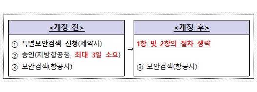 기존에는 바이오의약품이 특별보안검색 목록에 포함되어 있지 않아 제약업체는 매번 항공기로 수출하기 위해 관할 지방항공청에 특별보안검색 신청 및 승인을 받아야 했다.