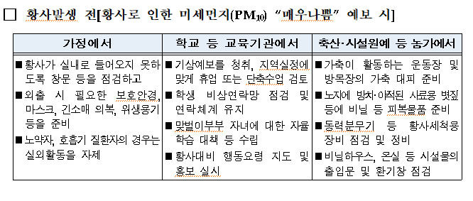가정에서는 황사가 실내로 들어오지 못하도록 창문 등을 사전에 점검하고, 노약자 등 취약계층은 실외활동 자제 등이 필요하다.