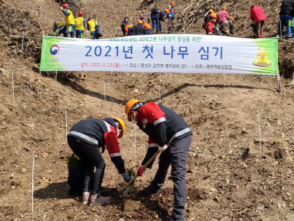 [‘사람이 살아가는 오늘 뉴스’ today1=강민주 기자] 북부지방산림청은 탄소중립 선언과 관련하여 2050년까지 30억 그루 나무심기 원년을 맞아 이산화탄소 배출 0%를 만들기 위한 첫 나무심기 행사를 3월 22일 강원도 횡성에서 지방산림청장을 비롯한 관계 공무원과 지역주민이 참여하여 나무심기 의지를 다졌다.