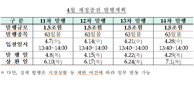 4월 재정증권 발행을 통해 마련한 재원(6조원)은 기존 재정증권 발행분 상환에 활용할 계획이다.