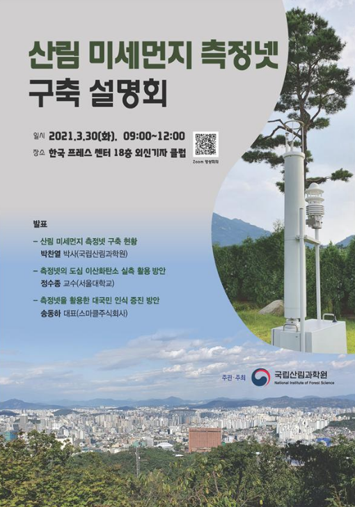 이날 행사에서는 ▲산림 미세먼지 측정넷 구축 현황(국립산림과학원 박찬열 연구관) ▲미세먼지 측정넷의 도심 이산화탄소 실측자료 활용 방안(서울대학교 정수종 교수) ▲미세먼지 측정넷을 활용한 대국민 인식 증진 방안(송동하 스마클주식회사 대표)에 대한 발표와 토론이 진행되었다.