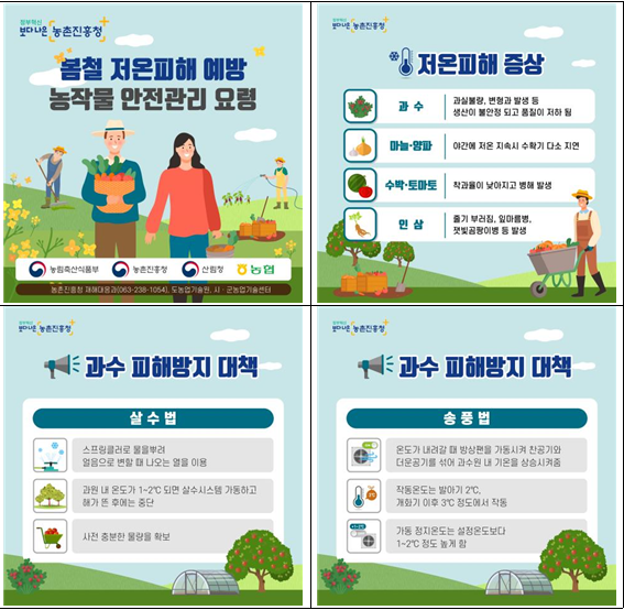 농촌진흥청 김정화 재해대응과장은 “2∼3월 평균온도가 높아 과수 꽃이 일찍 피고 인삼 싹이 빨리 나오면서 봄철 저온으로 인한 피해 위험이 높을 것으로 보인다.”라며, “과수 꽃 피는 시기와 인삼 싹이 트는 시기에 기상 동향을 잘 살피고, 저온피해 방지 대책을 적극 실천하여 안정적인 결실량을 확보할 수 있도록 노력을 당부 드린다.”라고 말했다.