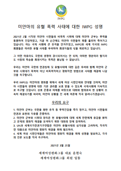 IWPG는 성명을 통해 미얀마 군부의 무력진압 중단과 시민들의 인권과 표현의 자유를 존중, 미얀마 군부와 시위대 양측 평화적 해결을 위해 대화의 장에 참여 요구, UN과 세계국가인권기구연합의 적극적인 대응 촉구, 세계 여성 시민단체들의 미얀마 평화 위해 성명 발표 촉구, 각국의 언론 보도를 적극 촉구하는 등의 내용을 미얀마 당국과 국제사회에 요청했다.